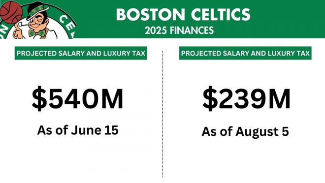 在今年夏天,凯尔特人进行了一系列神操作,他们通过51天的操作, 成功将球队薪资和奢侈税降至2.39亿美元,省了3.01亿美元。要知道,在6月15日,凯尔特人的受保障薪资加上奢侈税高达5.4