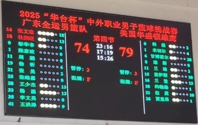 广东全运男篮最终74比79不敌美国华盛顿战鹰队,这场比赛广东首节打得非常好,无奈下半场开始之后,体能下滑,失误增加,命中率也不行,最终造成球队广东在第三节出现崩盘,末节对于关键球