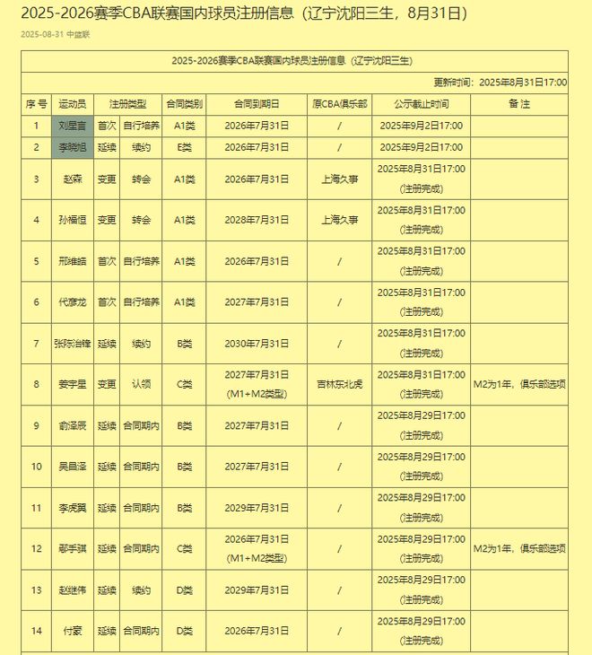 悬念揭晓!辽篮14人大名单出炉,玄冥二老正式拆散,多达5位新人希望的挑战并存!北京时间8月31日晚,随着CBA本土球员注册截止,辽篮14人大名单也正式出炉了。分别是李晓旭、赵继伟、付