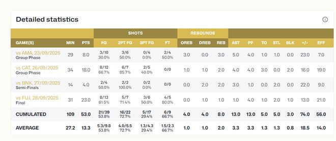 亚俱杯上杨舒予场均27.2分钟,拿到13.3分3.3助攻2篮板1.3抢断0.8盖帽,命中率53.8%,三分命中率29.4%。