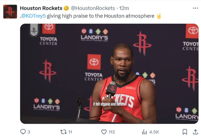 美国时间的9月29日恰巧是火箭新援凯文-杜兰特37岁的生日,火箭队官方也祝贺KD生日快乐,而且这一天也是休斯顿火箭队的媒体日,这对于杜兰特来说算是双喜临门,因为这支球队对他的爱很热烈。