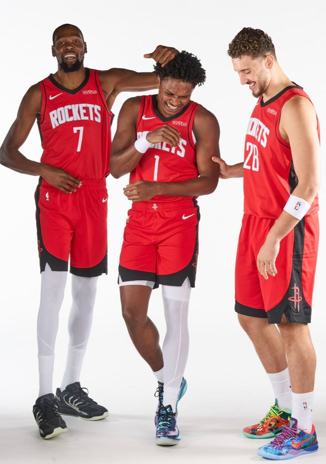 球队官方晒出最新三巨头的定妆照,杜兰特、阿门、申京三人在拍摄现场玩的非常开心,感觉三人已经建立了一些联系,杜兰特也一直让阿门站在C位上,阿门在采访中提到:我从小就看杜兰特打球,没想到有朝一日可以跟他在一支球队打球,这一切都太疯狂了。