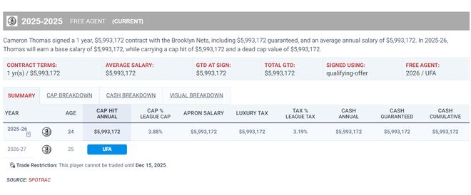 今夏篮网并没有给托马斯想要的均薪3000万长约合同,最终他只能接受一年600万的资质报价重返布鲁克林,上赛季他已经场均24分,相信大家也知道为何托马斯无法获得管理层认可。