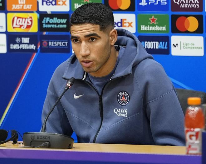 当地时间9月30日,巴黎圣日耳曼球员阿什拉夫出席了球队对阵巴塞罗那的赛前新闻发布会。