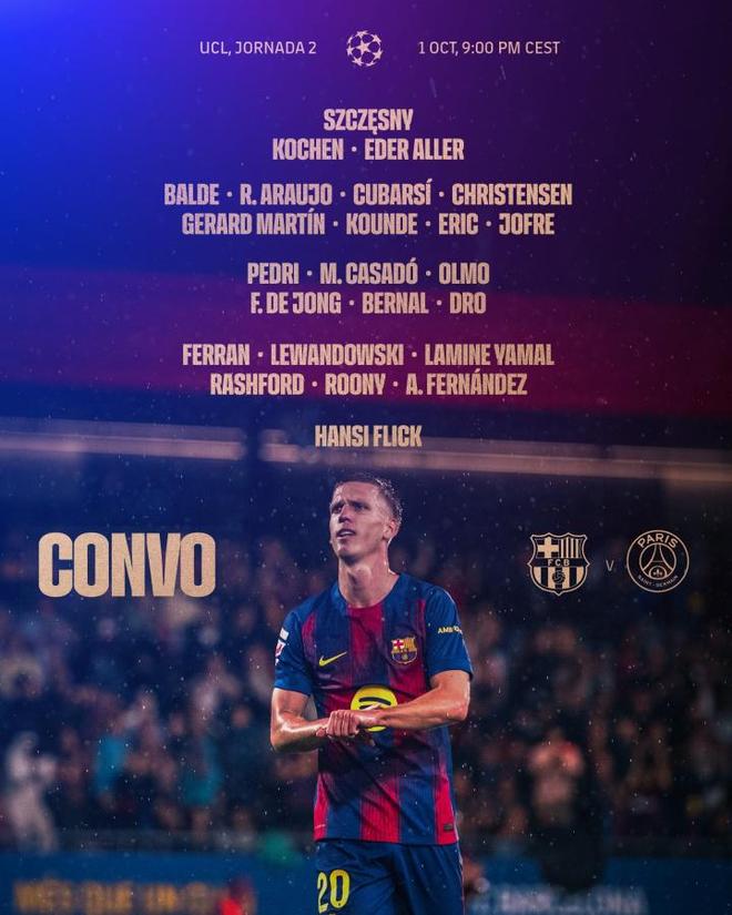 雷速体育10月1日讯 欧冠第二轮,巴萨vs巴黎。赛前,巴萨公布本场比赛大名单。
