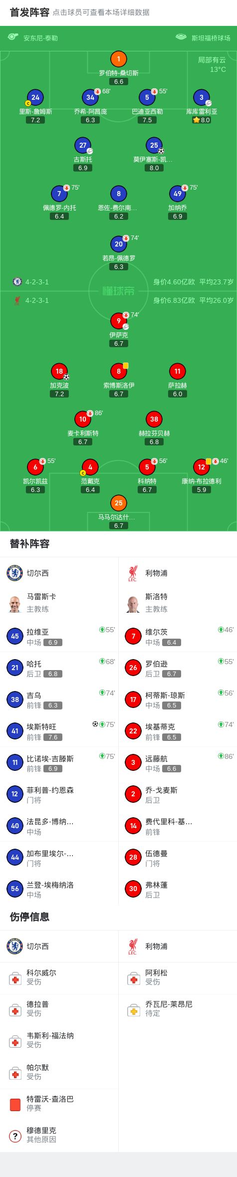 北京时间10月5日,英格兰足球超级联赛第7轮展开较量,切尔西坐镇主场迎战利物浦。上半场凯塞多轰出世界波。下半场索博传中,伊萨克轻巧做球,加克波门前捅射得手,补时阶段库库雷利亚传中,埃斯特旺后点破门完成绝杀,之后马雷斯卡吃到第二张黄牌,被红牌罚出场。最终切尔西2-1战胜利物浦。