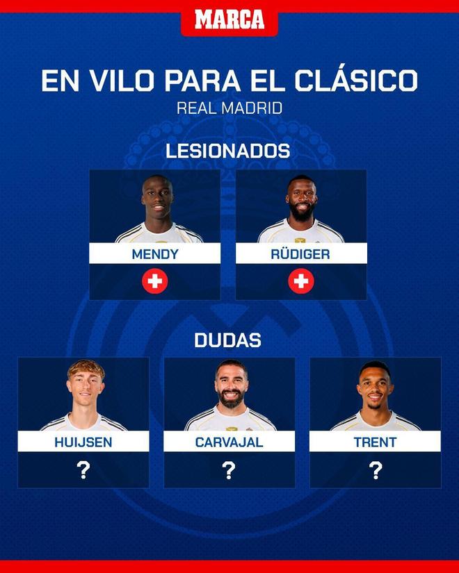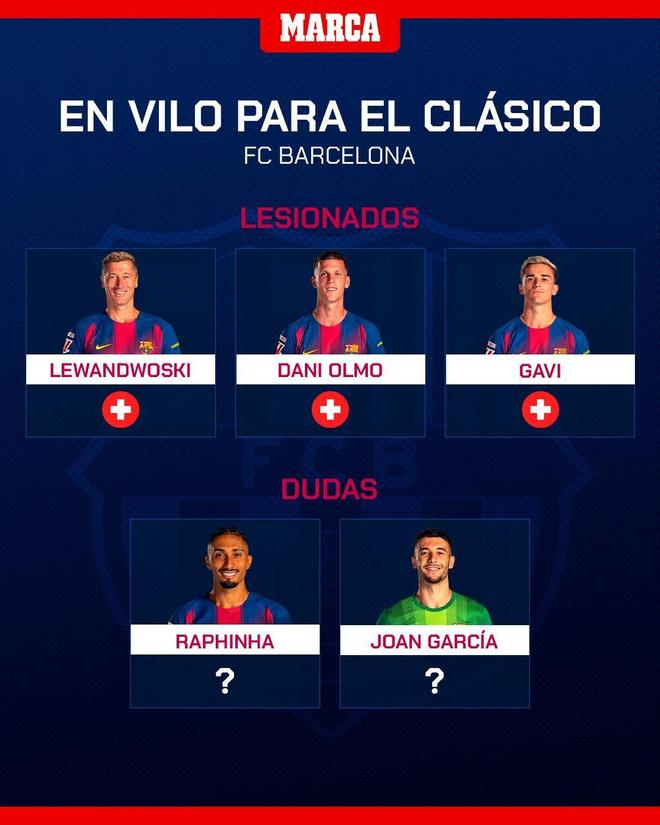 西班牙国家德比将于北京时间10月26日打响,本周五,《马卡报》列出了两队可能伤缺的球员名单,其中莱万、奥尔莫、门迪、吕迪格在列。