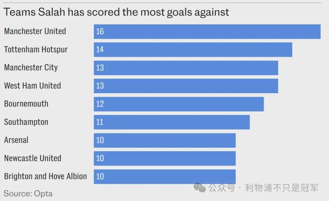 萨拉赫对阵曼联的纪录是非凡的。他已经对利物浦的这个历史性对手打进了16球,没有哪支球队更能从萨拉赫身上感受到痛苦。他在这项交锋中的总进球数比双方任何球员都至少多出7个,这巩固了他作为"大场面先生"的声誉。
