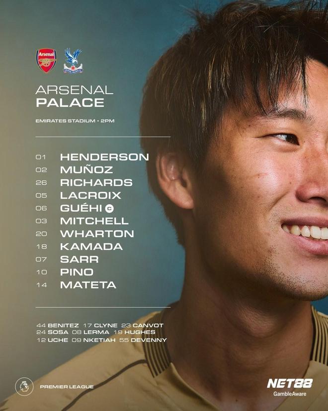 水晶宫首发:1-迪恩-亨德森、2-穆尼奥斯、26-克里斯-理查兹、5-拉克鲁瓦、6-格伊、3-米切尔、20-亚当-沃顿、18-镰田大地、7-伊斯梅拉-萨尔、10-耶雷米-皮诺、14-马特塔