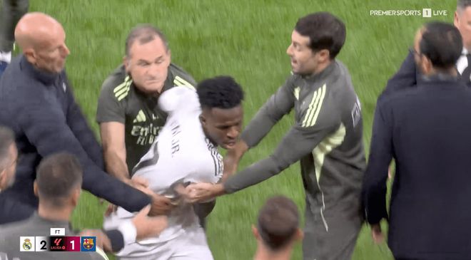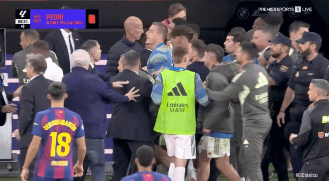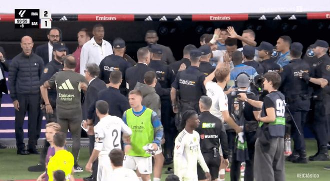 巴尔韦德、米利唐、贝林厄姆、吕迪格和阿拉巴都跑向了巴萨的替补席,巴萨的拉菲尼亚和埃里克·加西亚参与其中,双方的工作人员也参与其中。当警察介入并平息了事态时,米利唐被包围,并一度举起了双手。
